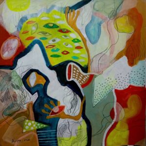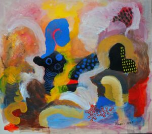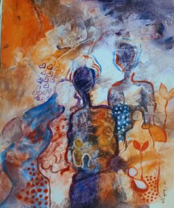 ৪. পৌরাণিক আখ্যান : এ ছবিতে সৃষ্টিসম্পর্কিত ভাবনার গভীর অভিনিবেশ পরিলক্ষিত হয়। ছবিটির কেন্দ্রজুড়ে কয়েকটি মাতৃত্বের অবয়ব লক্ষনীয় শুধু তাই নয়, এখানে তুলনামূলক প্রতিভাস দেখতে পাই। দুটো অবয়বের ভেতর মানবশিশু অন্য একটির ভেতর বৃক্ষের অঙ্কুরোদগম লক্ষণীয়। শিল্পী বিশেষ একটি অভিপ্রায়ের সন্নিবেশ ঘটিয়েছেন— যা দর্শককে ভাবাবেই। এভাবেই শিল্পী ও দর্শকের মাঝে ভাবনার মেলবন্ধন ঘটানোর প্রয়াস রয়েছে তার বেশির ভাগ কাজে। খুবই সাদামাটা সারফেসের মাধ্যমে রং ও রেখায় এ কাজটি তিনি চিত্রিত করেছেন।