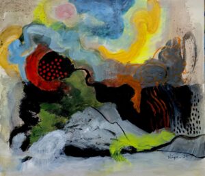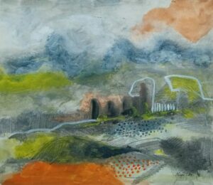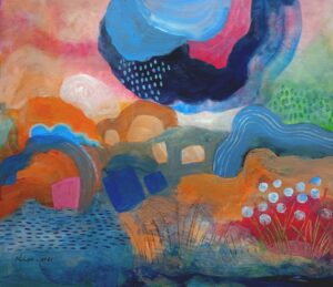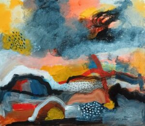 ৩. অস্পৃশ্য অনুভূমি : এটি ভূদৃশের ইঙ্গিত দেয়। ইঙ্গিত দেয় এজন্যে বলছি যে এখানে সরাসরি গাছপালা ঘরবাড়ি বা প্রচলিত দৃশ্য তিনি আঁকেন নি। একজন দক্ষ শিল্পীর মতো সারফেসকে রং ও তুলির সফট স্ট্রোকের মাধ্যমে একটি চমৎকার আবহ সৃষ্টি করেছেন। মাল্টি কালার থাকলেও একটা পেলবতা এবং নরম কোমল ভাব ফুটিয়ে তুলেছেন। এটিও খুব সুন্দর একটি কাজ।