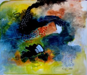 আবার আমরা শিল্পী নিপার সমসাময়িক রাজনৈতিক বাস্তবতার চিত্রও লক্ষ করি সেটি’২৪ এর জুলাই আন্দোলনকে উপজীব্য করেই। সেটি হলো— ৫. জুলাই আখ্যান – তরুণ প্রজন্মের ওপর রাষ্ট্রশক্তির বলপ্রয়োগ ও দমন এবং নিষ্ঠুরতাকে যেন এ ছবির মাধ্যমে তিনি ডকুমেন্টশন করে রাখতে চেয়েছেন। অত্যন্ত দক্ষতায় তুলে এনেছেন তিনি এ ঐতিহাসিক ঘটনাটিকে। তিনি রংয়ের অর্থবহতার ব্যাপারে বেশ সচেতন সেটা বোঝা যায় যখন ছবির বিষয়বস্তুর সাথে রংয়ের প্রয়োগ দেখে। পুরো ছবিতে লালের প্রাধান্য রেখে কমলা সবুজ কালোর মাধ্যমে জুলাইয়ের রক্তাক্ত ও বিপ্লবাত্মক বৈশিষ্ট্য, সবুজ দেশমাত্রিকা, ভালোবাসা বা মমত¦ ও প্রতিক্রিয়াকে চিত্রায়িত করেছেন। এতো গেলো রং। রংএর বাইরে যেসব অবজেক্ট তিনি তুলে আনেন তা হলো— খণ্ডিত হাত মৃত শায়িত মূর্তি যেগুলো আহত রক্তাক্ত আবার হিংস্র দাঁতাল প্রাণীর অস্তিত্ব বিষয়কে উপলব্ধি করতে সহায়তা করে। আবার মাঝখানে লালের মাঝে লেখা ‘শোন ধর্ম আর দেশকে মিলাতে যেও না’ তার একটু নিচে ৩৬ জুলাই লেখা আরো স্পষ্ট করেছে ছবিটি দেখে খুব সহজেই জুলাইকে বুঝবে দর্শক মাত্রেই। রং ফর্ম টেক্সার ব্রাশ স্ট্রোকিং রংয়ের মেশ ঘটানো সব মিলিয়ে এটি একটি নান্দনিক সৃষ্টি বলতে হবে।