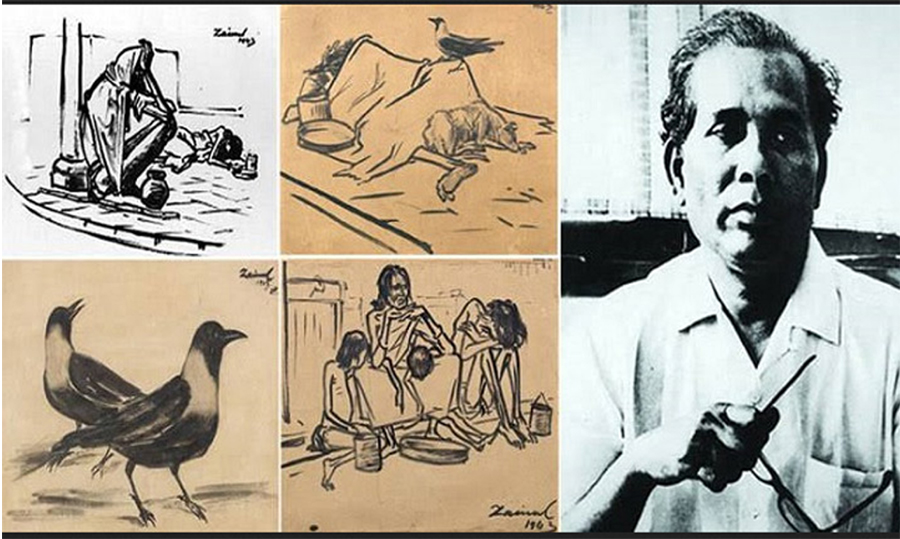 জয়নুল আবেদিনের আন্তর্জাতিক খ্যাতির মূল ভিত্তি ১৯৪৩ সালের বাংলার মন্বন্তর নিয়ে আঁকা দুর্ভিক্ষের চিত্রমালা। তিনি রাস্তায় পড়ে থাকা ক্ষুধার্ত, অস্থিসার মানুষ, মৃতদেহ ঘিরে কাক-কুকুর, মায়ের কোলে নিথর শিশু; এসব দৃশ্য দেখেছিলেন প্রতিদিনের যাতায়াতে।